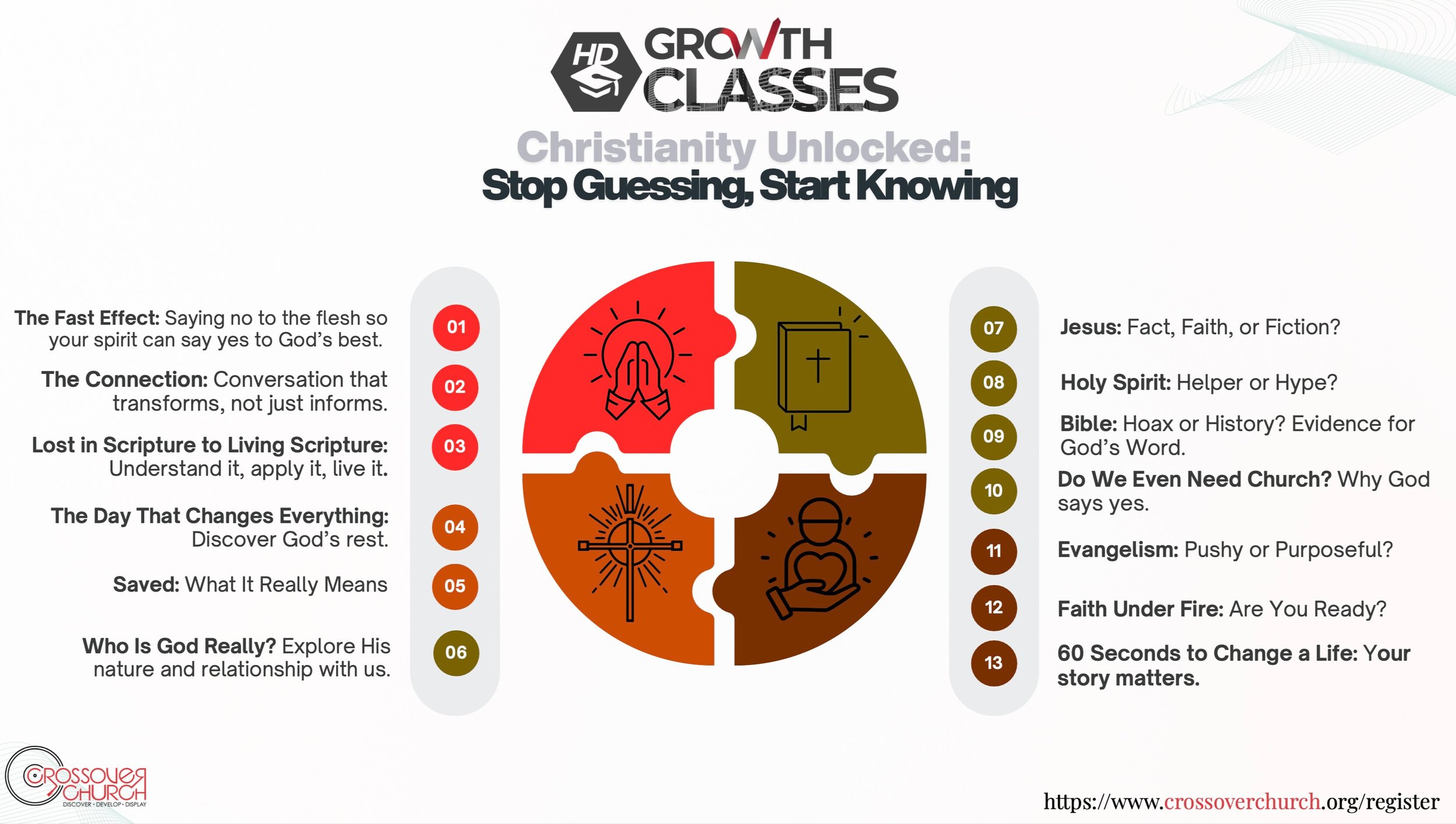 No fluff. No clichés. Just real answers. If you’ve ever questioned God, doubted the Bible, or wondered what authentic faith really looks like, these classes is for you. Bring your questions, challenge what you’ve heard, and discover a faith that’s clear, confident, and alive. Ready to stop guessing and start knowing?