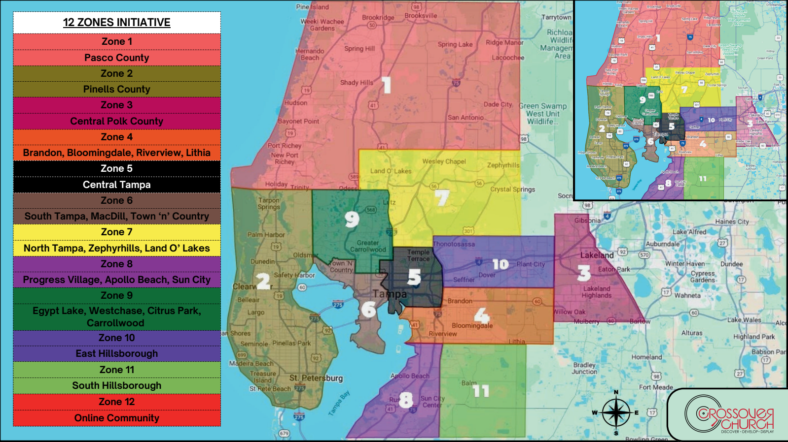 The Zones Initiative is designed to ensure that every member of Crossover is CONNECTED and CARED for in a system designed to providing personalized and timely support of each member of our church family. Our entire church family is organized into 12 Zones, led by a dedicated Zone Leader or Zone Leaders. This enables our church to be efficiently responsive to the needs of our members - whether an exciting need or a challenging need.